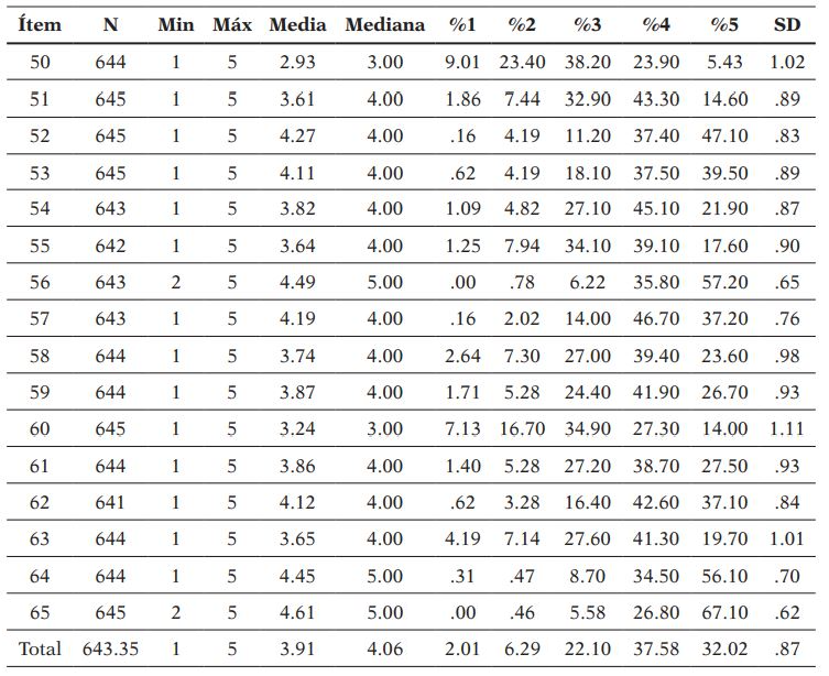 Para la realización de un análisis de fiabilidad del cuestionario ATI empleamos el método de consistencia interna basado en el alfa de Cronbach. Este análisis permite estimar la fiabilidad de un instrumento de medida compuesto por un conjunto de ítems, de tipo escala Likert 5, que esperamos midan la misma dimensión teórica (el mismo constructo). De esta manera, los ítems resultan sumables en una puntuación única que mide un rasgo que es importante en la construcción teórica del instrumento. La fiabilidad de la escala debe obtenerse siempre con los datos de cada muestra para garantizar la medida fiable del constructo en la muestra concreta de investigación. Como criterio general el coeficiente debe ser superior a .70 (George y Mallery, 2011). En el caso del cuestionario ATI a nivel global se obtuvo un coeficiente de alfa ordinal de .78, por lo que podemos considerar el coeficiente como aceptable. En este mismo sentido, otros autores proponen el coeficiente omega, también conocido como Rho de Jöreskog (Ventura- León y Caycho-Rodríguez, 2017), y como criterio general se considera que hay que obtener un coeficiente mayor de .70. En nuestro caso, el coeficiente de omega de McDonald para el global de la escala es de .79, por lo que obtenemos un valor aceptable. Por su parte, en el caso del Bloque II.3 de ítems obtenemos un índice de alfa de Cronbach de .82 y omega de McDonald .83, considerados ambos igualmente adecuados.