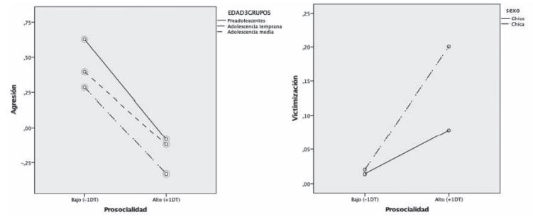 La interacción entre la edad y la prosocialidad fue significativa para los comportamientos de agresión (B = -.42; p <.05), no siendo significativos en el caso de la victimización (B =.04; p >.05) (ver Tabla 4). Los resultados del análisis simple slope mostraron una asociación negativa entre la agresión y la prosocialidad en preadolescentes (B = -.23; p <.001), en la adolescencia temprana (B = -.26; p <.001) y adolescencia media (B = -.17; p <.001). Los análisis follow-up mostraron además que el efecto de la prosocialidad sobre la agresión no fue significativamente diferente para los grupos de edad con niveles altos (B = -.07; . >.05) o bajos (B = -.04; p >.05) de prosocialidad (ver Figura 1). La interacción entre sexo y prosocialidad fue significativa para la victimización (B =.52; p <.05), pero no para la agresión (B =.23; . >.05) (ver Tabla 4). Los resultados del análisis simple slope mostraron que no hay una asociación entre prosocialidad y victimización en el caso de los chicos (B = -.01; . >.05), ni de las chicas (B =.04; . >.05). Los análisis follow-up mostraron que el efecto de la victimización no fue significativamente diferente para chicos y chicas con altos niveles de prosocialidad (B =.05; p >.05), ni con bajos niveles (B =.00; p >.05) (Figura 1).