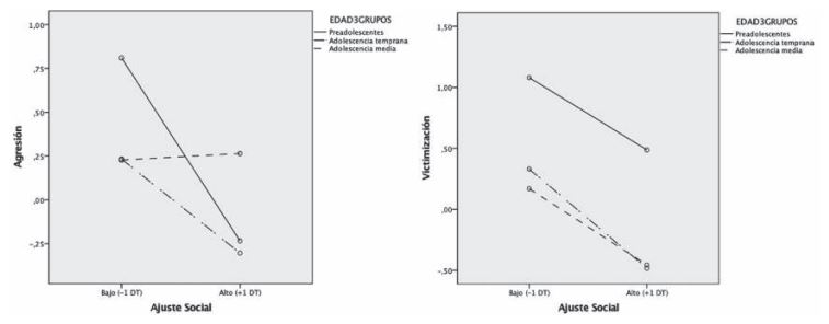 La edad moderó los efectos del ajuste social sobre los comportamientos de agresión (B =.46; p <.001) (ver Tabla 4). Los análisis mostraron una asociación negativa entre agresión y ajuste social en preadolescentes (B = -.32; p <.001) y en adolescencia temprana (B = -.19; p<.001), pero no en la adolescencia media (B = -.49; p >.05). Los efectos del ajuste social sobre la agresión fueron estadísticamente mayores en preadolescentes, concretamente en este grupo de edad, el efecto sobre la agresión fue significativamente diferente para los escolares con altos niveles de ajuste social (B =.11; p =.01), y con bajos niveles (B = -.15; p <.001) (ver Figura 2).