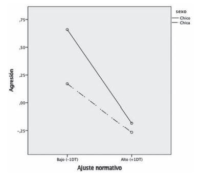 Se observó una interacción significativa entre el sexo y ajuste normativo sobre la agresión (B =.43; p <.005), pero no sobre la victimización (B =.11; p >.005) (ver Tabla 4). Los resultados de moderación indicaron diferencias estadísticamente significativas entre chicos y chicas en la asociación del ajuste normativo y los comportamientos de agresión, obteniéndose un efecto negativo en chicos (B = -.29; p <.001) y en chicas (B = -.20; p <.001). El efecto sobre la agresión no fue significativamente diferente para chicos y chicas con altos niveles de ajuste normativo (B = -.04; p >.05), pero sí con bajos niveles (B = -.16; p <.001), siendo en ellas en las que se observa un mayor efecto (Figura 3).