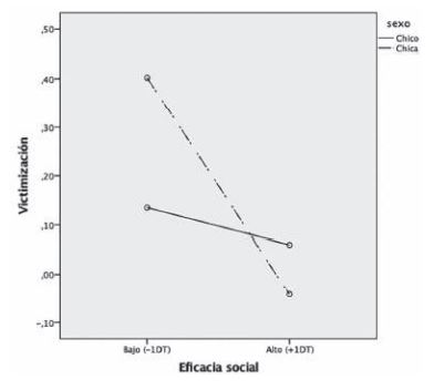 Los resultados de la regresión mostraron una interacción significativa entre el sexo y la eficacia social en la victimización (B = -.66; p <.001), pero no sobre la agresión (B = -.21; p >.05) (ver Tabla 4). Los análisis simple slope mostraron que esta asociación negativa fue significativa en chicas (B = -.13; p <.001) pero no en chicos (B = -.05; p >.05). Los análisis mostraron que el efecto de la eficacia social sobre la victimización solo fue significativamente diferente para niños y niñas con bajos niveles de eficacia (B = -.11; p <.05). Esto indica que fueron las chicas con niveles bajos de eficacia las que mostraron mayores niveles de victimización en comparación con los chicos (Figura 4).