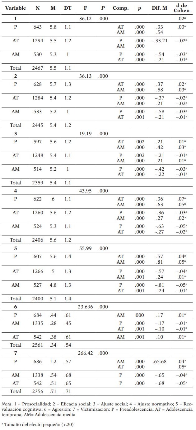 Para valorar las diferencias de edad entre los participantes se establecieron tres grupos, de 10 a 12 años (preadolescentes), de 13 a 14 (adolescencia temprana) y de 15 a 16 (adolescencia media). Se observaron diferencias significativas en todas las dimensiones de la competencia social, siendo los preadolescentes quienes presentaron las medias más elevadas, seguidos de los adolescentes de 13 a 14 años (d =.02) (ver Tabla 2). Se observaron diferencias significativas en función de la edad en las dimensiones de agresión y victimización. En agresión se encontraron diferencias entre todos los grupos de edad, mostrando los preadolescentes las medias más elevadas (d =.01). En victimización se observaron diferencias significativas entre los preadolescentes y los adolescentes de 13 a 14 años y los de 14 a 16 años, presentando los preadolescentes las medias más elevadas (d = -.01).