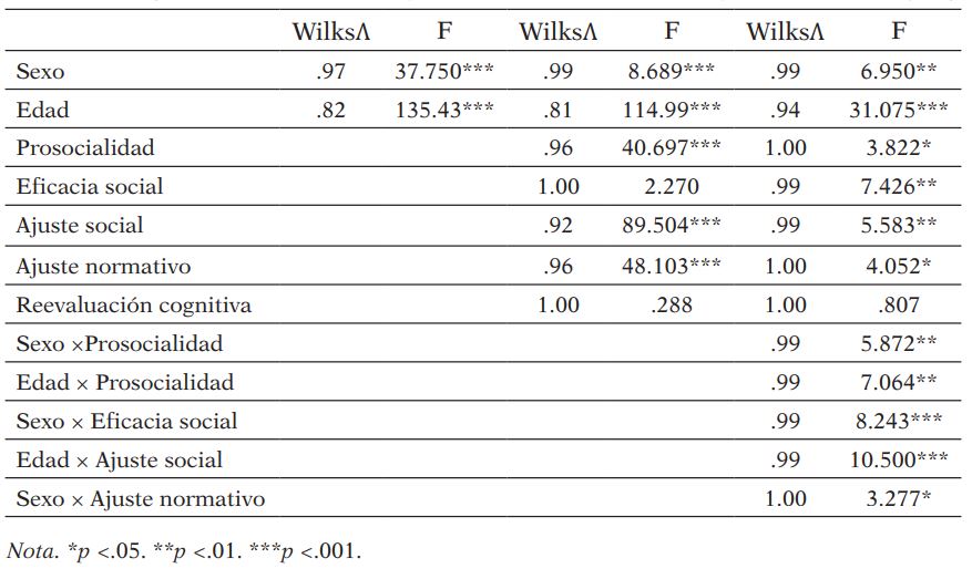 Los análisis del modelo de regresión multivariante mostraron relaciones significativas para las dos dimensiones de implicación en bullying (variables dependientes) (ver Tabla 3). Tanto el sexo como la edad se asociaron significativamente con las variables dependientes en el modelo 1, asociaciones que siguieron siendo estadísticamente significativas en los sucesivos modelos. En el modelo 2, la prosocialidad, la eficacia social, el ajuste social y el ajuste normativo se asociaron significativamente con las variables dependientes. Para el modelo 3, los resultados indicaron que la interacción entre el sexo y la prosocialidad, la edad y la prosocialidad, el sexo y la eficacia social, la edad y el ajuste social y el sexo y el ajuste normativo se relacionaron significativamente con las variables dependientes.
