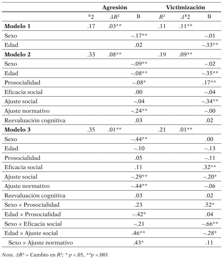 Los análisis de regresión lineal en los tres modelos propuestos para las dimensiones de agresión y victimización mostraron resultados estadísticamente significativos para los comportamientos de agresión, F = 24.667, gl = 12, p <.001 (Tabla 4). Atendiendo a la significatividad del cambio en R2, se seleccionó el modelo 3, con un valor de R2 de .11. El análisis de independencia de los residuos, que confirma la validez del modelo, arrojó un valor de 1.74, confirmando la ausencia de autocorrelación positiva (valores cercanos a 0) y negativa (valores cercanos a 4) según el estadístico de Durbin- Watson. El sexo fue una variable relacionada de forma significativa en todos los modelos. La prosocialidad fue asociada de forma positiva con la agresión. El ajuste normativo se asoció negativamente con los comportamientos de agresión (ver Tabla 4).