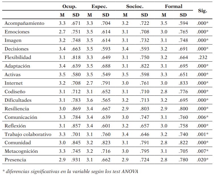 A simple vista, se puede observar la preponderancia del ámbito de especializada en el uso de metodologías para el empoderamiento (obtiene las medias más altas en 13 de las 17 metodologías), obteniendo las medias más bajas solo en el uso de internet y el trabajo colaborativo. Por el contrario, también se observa que el ámbito de la educación formal es el que obtiene las medias más bajas en el uso de metodologías para el empoderamiento (9 de las 17 metodologías) y solo destaca en el uso del acompañamiento al joven. El ámbito sociocultural también obtiene las medias más bajas en 7 metodologías. Sí destaca, siguiendo con las características del ámbito, en el uso de metodologías activas, codiseño de los aprendizajes (aunque está igual valorado en todo el ámbito social), y en el trabajo colaborativo. Por último, en el ámbito ocupacional, destacan las medias más altas en el uso de metodologías activas, el uso de internet, el codiseño de aprendizajes, y la metacognición.