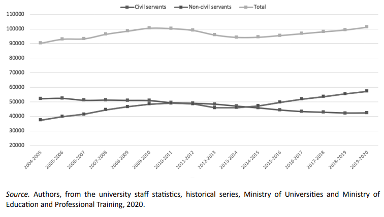 Abstract: The implementation of the 2001 Organic Law on Universities and its subsequent reform in 2007 led to a transformation in the employment model for teaching staff at Spanish public universities. Amongst the main changes were the introduction of temporary positions for access to a teaching career (teaching assistants and assistant professors), the creation of the position of associate professor as a non-civil service route to stabilization, the establishment of new precarious positions such as interim substitute teachers and the implementation of a national accreditation system to apply for positions. Two decades after its implementation, this paper analyses the consequences that the last major university reform has had on the labour model for teaching staff in Spanish public universities. To that end, a two-step analysis is presented. First, to put the recent changes into context, an overview is provided of the legislation that has structured the different employment models for teaching staff up to the present day. Second, using national university staff statistics, the process of implementing the current system in the 2004-20 period is analysed. The results show how precariousness, far from being a new phenomenon, has been a constant in Spanish universities. However, the latest reform has led to advances in the process of weakening the link between the teaching staff and the civil service and with more precarious contract positions, although these developments vary substantially between the different universities in the country.