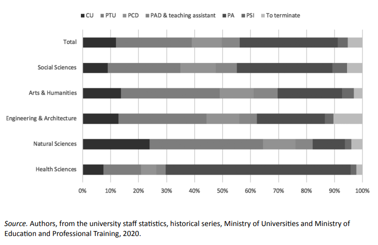 Precariousness goes beyond weakening the civil servant system in the universities. An analysis of the distribution of the university staff positions during the 2019-20 academic year (Figure 2) shows how the precarious PA and PSI positions comprise 40 per cent of the teaching staff. The result is a workplace characterized by its duality, with the structural staff guaranteed stability and good labour and salary conditions as opposed to a precarious staff, who receive low salaries and have unstable work contracts whose length is often unknown. This labour model is the representation of a low-cost university and replicates the staff management policies used by most private companies. Although access to the PAY and PAD positions is a legal beginning to an academic career, the large percentage of PSI and PA positions reveals that this process is actually longer and begins with precarious positions. However, and importantly, the processes of desfuncionarización and precarization described operate differently in the different areas. With the exception of the health sciences, which are subject to distinct hiring criteria, these processes are more common in the social sciences and practically non-existent in the case of the natural sciences (Figure 2).