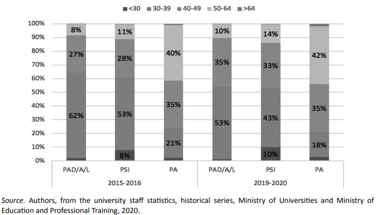 Finally, from 2016 to 2020, various changes occurred that created the current labour model in Spanish universities. There was a process of promotion at the top, with a significant decrease in civil servant associate professors that corresponded to an increase in the number of chair professors. The previous replacement rate was raised to 100 per cent in response to the improved economic situation and, especially, a change in government priorities (Law 6/2018). Accordingly, access to the PAD positions opened up, and the bottleneck created by the cutback policies began to break up. However, precariousness continued with an increase in the numbers of professors of practice and substitutes.