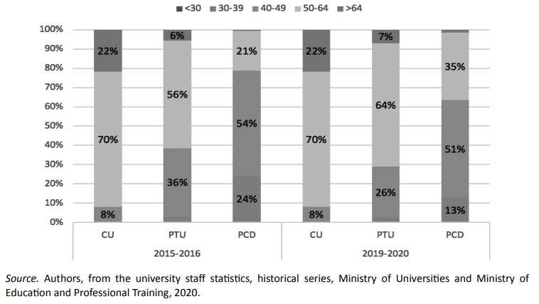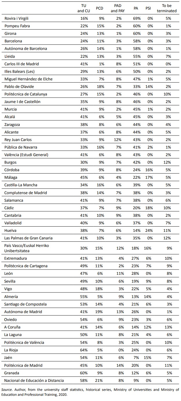 In the popular imagination, the figure of the university professor is usually associated with a high social position, significant status, autonomy and excellent working conditions. Although this image corresponds to the characteristics of teaching positions in later stages, once a professor’s academic career has become established, the reality for a vast majority of university teachers in Spain is quite different. Low salaries, a heavy research burden, teaching and administrative duties, a high number of temporary jobs and delayed (or impossible) access to positions with stable contracts are merely some of the problems highlighted in the recent literature on this subject (García-Calavia, 2014; Noll, 2019). Indeed, twenty- first-century Spanish universities are characterized by a process of widespread job precariousness for teachers and researchers (Castillo & Moré, 2016).