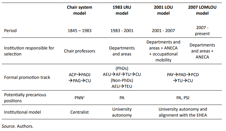 Thirdly, the current employment model is also characterized by an explicit attempt to limit the discretionary power that the 1983 LRU gave departments and areas to select staff. To accomplish this, a system of accreditation was implemented that determines access to the different positions (regulated since 2000 by the National Agency for Quality Assessment and Accreditation, or ANECA). This system has been criticized as clearly insufficient (Carreras, 2007); although departments are no longer permitted to select or promote teachers without accreditation, they have preserved their discretionary power with regard to requesting new positions and choosing the candidates for them. A department can wait until their interim professors are available before they send out a call for new positions and influence the selection process by designing the positions and requirements to match local candidates (Corona-Sobrino, 2021). Fourth, and finally, the current model makes an explicit commitment to excellence in a quite specific way. Beyond the need for accreditation for certain teaching positions, the new model eliminates the possibility of obtaining a stable teaching career for new non-PhDs. This measure, which was designed to improve the quality and competence of the teaching staff, closed off previous promotion tracks that did not require this degree. Some authors have criticized the supposed ideology of excellence, viewing it as the application of Taylorist management techniques (Noll, 2019) and neoliberalist ideas within the university (Conesa-Carpintero & González-Ramos, 2017).