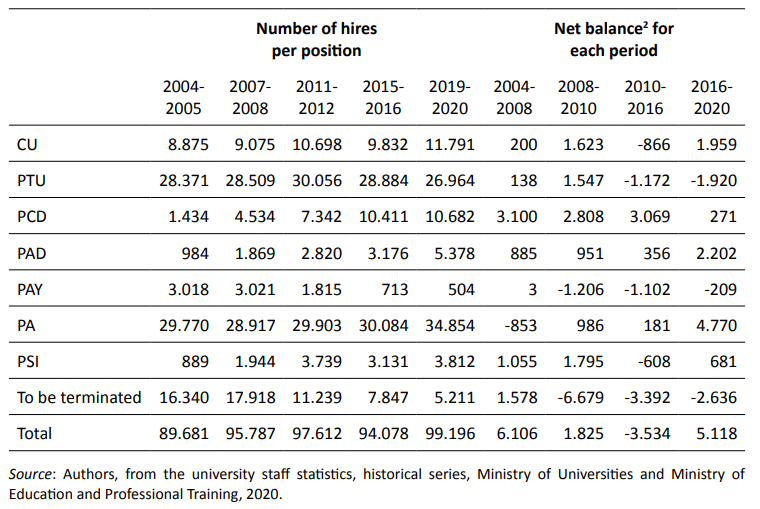 Although the 2021 LOU regulation and its 2007 reform introduced a new labour model, its implementation was subject to three fundamental forces: economic contingencies, especially periods of boom and bust; the political measures taken by the central government and the universities themselves; and resistance and negotiation on the part of the primary institutional agents, departments and areas. To better understand how these three forces configured the current labour model over time, Table 2 analyses the variations in the different contract positions during four key periods: 2001-08, when the 2001 LOU was in force; 2008-12, when the LOMLOU reform was introduced, but before the so-called austerity policies were applied; 2012-16, a time characterized by cutbacks; and 2016-20, when the austerity policies softened.