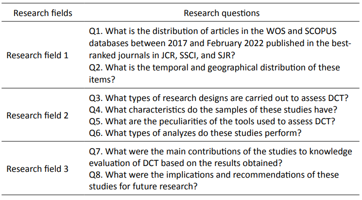 Given this prolific DCT research productivity of research, the absence of literature reviews regarding how DCT is evaluated, what information collection instruments exist, or the results obtained in the various studies is striking. Thus, this work has been undertaken from a systematic review of the literature considering the databases of the most prestigious scientific journals.