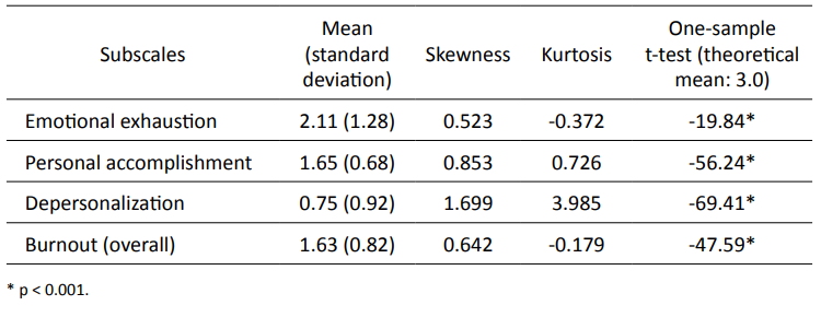 According to the previous results, to the theoretical value of the mean (4.0, since it is assumed that the instrument, having a scale from 1 to 6, it is assumed that the value of 4 and more is considered high), and to the asymmetry coefficient, it is found that teachers have high levels of vocation in its three dimensions. In addition, a normal distribution is assumed because the sample size (n= 824) of the present investigation is representative in comparison with similar studies that have used parametric statistics (Lumley et al., 2002). Now, we proceed to report the analysis of burnout in teachers (Table 3).