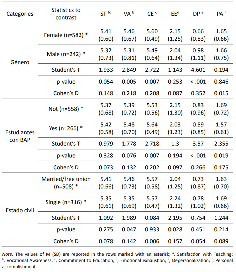 In this section, the comparisons are analyzed according to the socio-occupational variables of the subscales that make up the research. To facilitate the analysis, the comparison by gender, students with BLP and marital status with the T test for independent samples is presented in the first instance (Table 5).