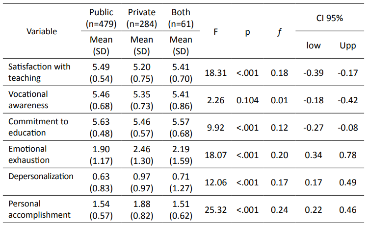 Among the findings that were found at a comparative level, it stands out that teachers who work in the private sphere are more exposed to wear and tear. The current conditions derived from the COVID-19 pandemic have had a harmful impact on the economic resources of private institutions: migration of students to the public sector as well as partial abandonment. Consequently, job insecurity or, in the worst of cases, the decrease in their income has a negative influence on the psychological well-being of individuals. On the other hand, gender shows significant differences in vocational awareness and depersonalization, being higher in women for the first case and higher in men for the second one. The results are corroborated by the development of greater self-knowledge skills in women and the more recurrent presence of cynical or dismissive behaviors in men (Tašner et al., 2017).