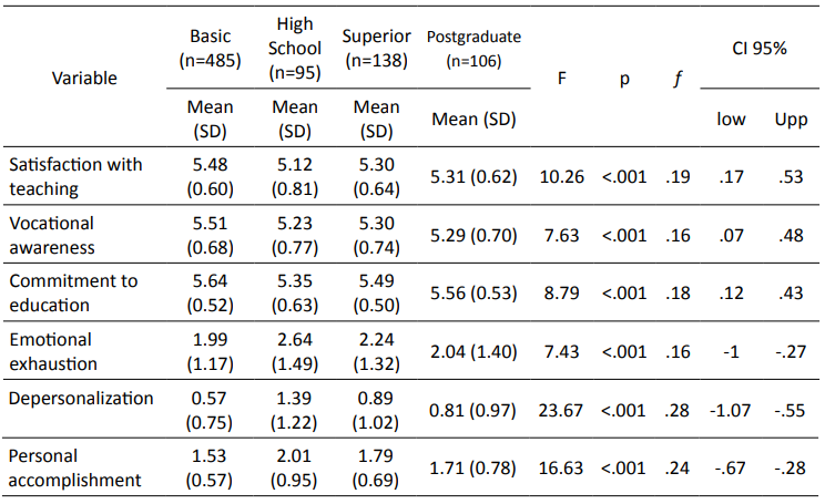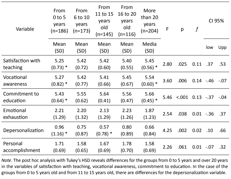 Post hoc analysis was applied and differences were found for the basic and upper secondary level groups, the latter being significantly lower compared to the other educational levels. It stands out that in the case of depersonalization the size of the effect is medium, and for the other variables, it has a small size. To conclude the comparative analysis, the results of the differences based on the years of teaching experience are presented (Table 8).