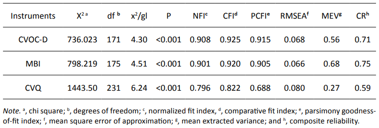 The following table shows the analysis of the validity of the instruments through Confirmatory Factor Analysis (CFA) following the maximum likelihood method (Table 1).