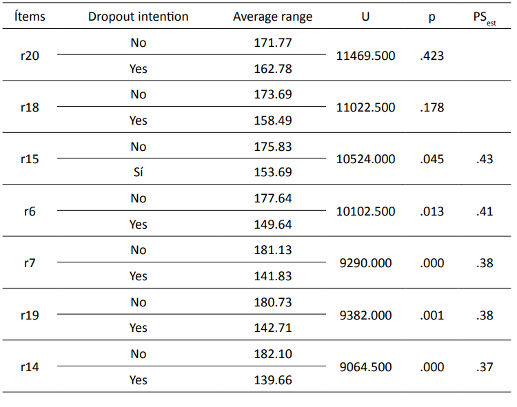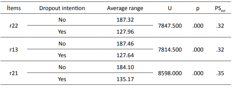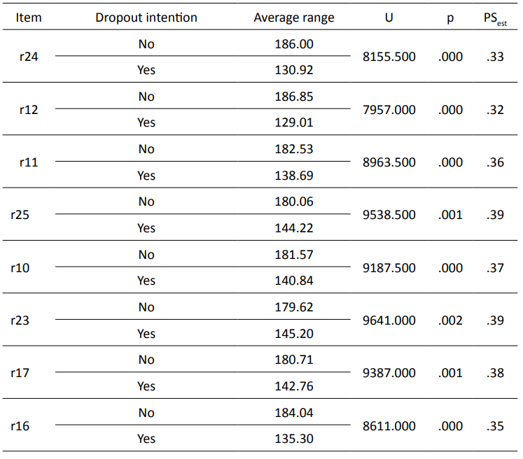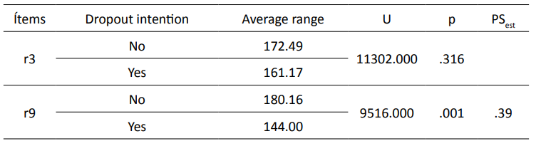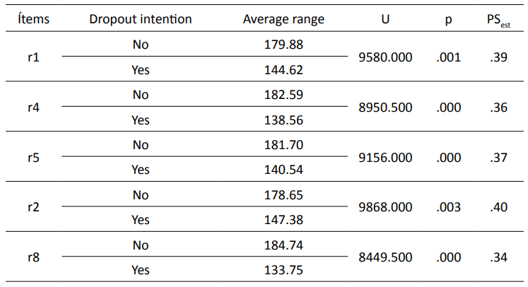 The fourth of the factors analysed (table 9) also showed inequalities, with the group of students who intended to abandon their university studies being those who scored the lowest in the set of items proposed. Specifically, these students indicated that they found it difficult to seek help when they had difficulties (U=8598.000; R=135.17; p<.000; PSest=.35). Furthermore, they stated that they were not clear about their purpose in life (U=7847.500; R=127.96; p<.000; PSest=.32) and that they did not have adequate control over their life development (U=7814.500; R=127.64; p<.000; PSest=.32).