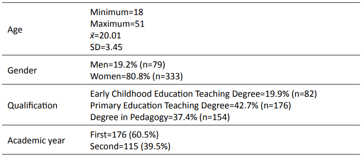 The target population for this study was university students studying undergraduate courses associated with the education area at the University of La Laguna (ULL): Bachelor’s Degree in Early Childhood Education, Bachelor’s Degree in Primary Education and Bachelor’s Degree in Pedagogy. During academic year 2021/2022, the period in which the information gathering process was carried out, a total of 2341 students were enrolled in these university degrees, according to data provided by the Analysis and Planning Office (GAP) of the ULL. Thus, to achieve a confidence level of 95% and a margin of error of ±5%, the final study population should be at least 331 students. In the particular case of this study, and by means of a non-random accidental sample selection procedure, a total of 412 (n=412) students participated, which placed the calculation of the sample representativeness at 96% confidence and a ±4.6% margin of error. The general characteristics of the sample participating in the study are shown in table 1.