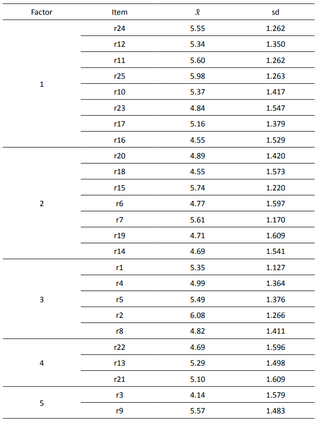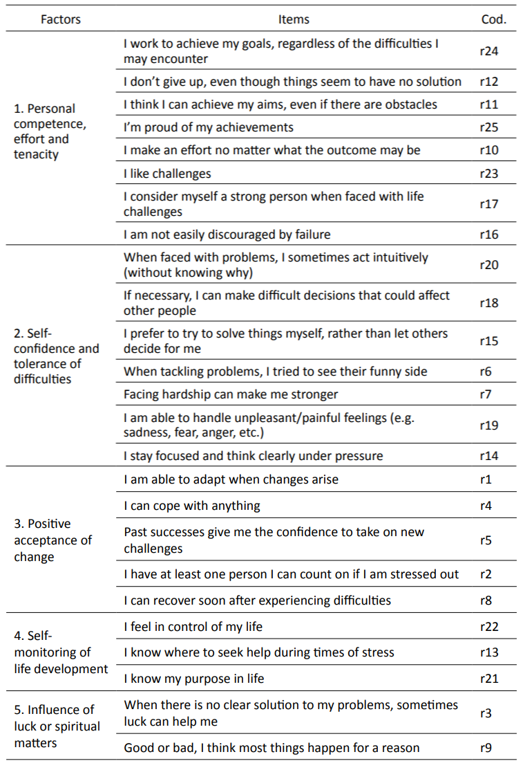 For data collection, an ad hoc instrument designated the “Resilience and University Dropout Intention Questionnaire” was designed and constructed based on the Connor-Davidson Resilience Scale (CD-RISC) of Connor-Davidson (2003). This scale includes a total of 5 factors distributed in 25 Likert-type items (table 2). The reliability and validity results obtained (internal consistency, test-retest, convergent validity and discriminant validity) and the factor analysis carried out on the original scale present values accepted by the literature for use as a tool for measuring the resilience construct, which can be consulted in the work of Connor and Davidson (2003).