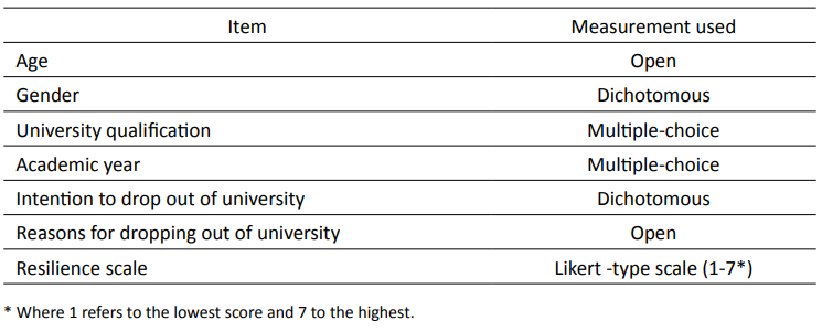 The questionnaire also included other questions on socio-demographic (age, gender), academic (university degree, academic year) and dropout (intention to drop out of studies and reasons for such intention) issues. This type of information was used, on the one hand, to describe the characteristics of the participant sample and, on the other, to assess the possible impact of resilience on the intention to drop out of university studies. The type of measures used in the questionnaire applied are presented in Table 3.
