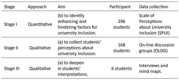A mixed study was carried out in three stages: a first quantitative stage, where an initial approach to the field of study was made, and a second and third qualitative stage, delving into the participants’ discourses on diversity and university inclusion. The scope of this study is not only to take advantage of the potential of mixed research (Stacciarini & Cook, 2015), but to give the qualitative perspective a primary character that is complemented by the secondary quantitative insights.