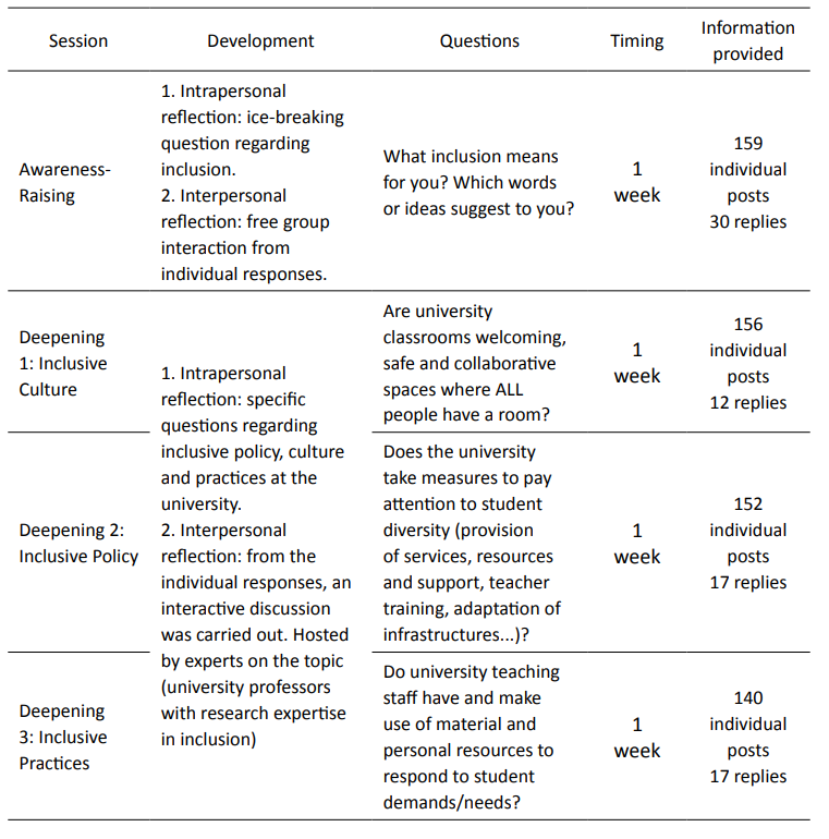 Due to the health measures adopted in the institutions of the Galician University System, an interactive space was created (Stage II) through a forum for students to discuss inclusion in a targeted manner. In order to deepen the students’ appraisals of university inclusion, the technique selected was rapid online focus groups (Blake et al., 2021) (also called reflective essays by Rahiem et al., 2021). For this purpose, different sequential moments of reflection were proposed: intrapersonal (individual evaluations) and interpersonal (group evaluations resulting from the interactions between participants) by means of written word (Table 2):