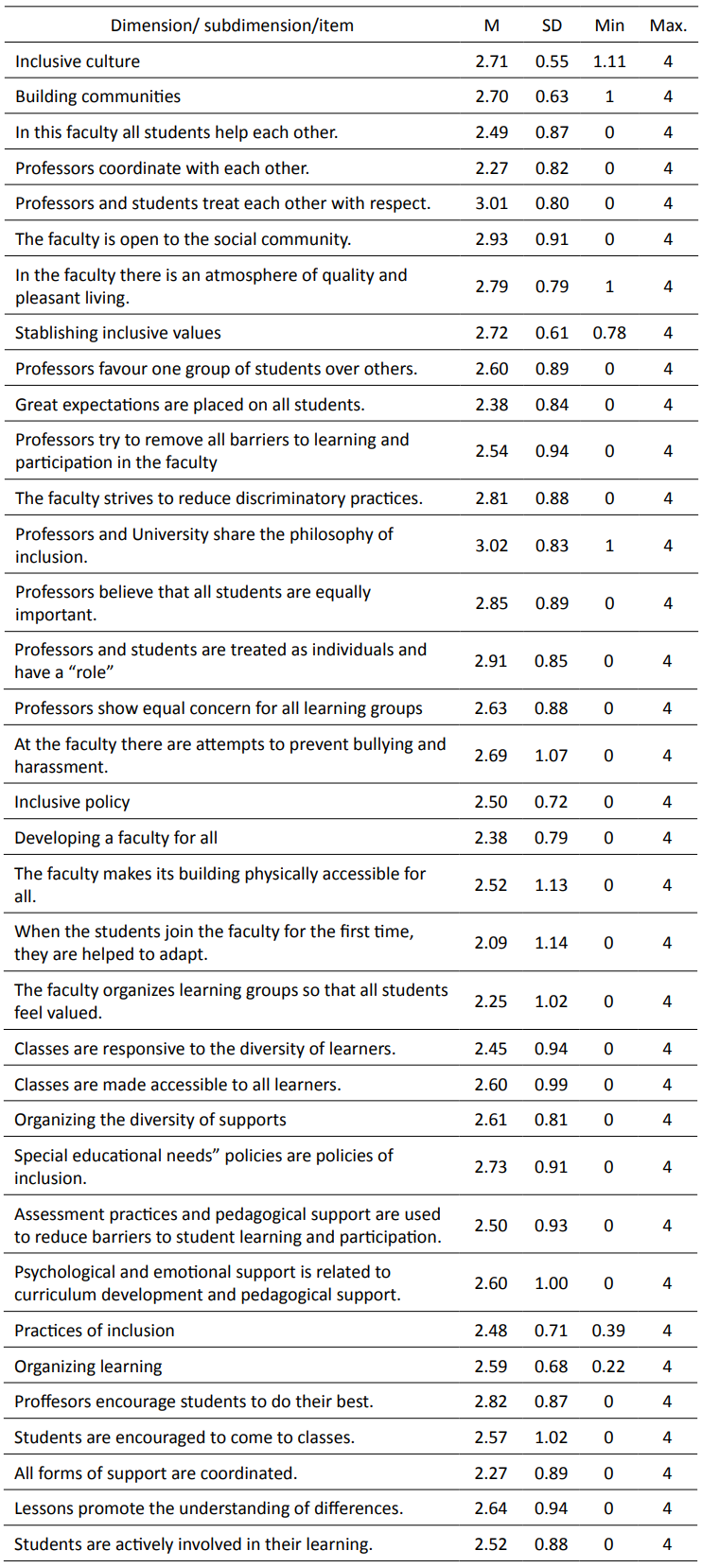 From the initial analysis of the quantitative data (Table 3) it was found that, on average, students placed the level of inclusiveness at the university in the middle of the 0-4 scale (M = 2.68; SD = 0. 55); that is, only sometimes the University favours inclusive culture (M = 2.71; SD = 0.55), policy (M = 2.50; SD = 0.72) and practices (M = 2.48; SD = 0.71), so there is still room for improvement. Most items were placed in the category sometimes, although with a positive tendency towards usually, with exceptions placed in the category sometimes, with a negative tendency towards hardly ever.