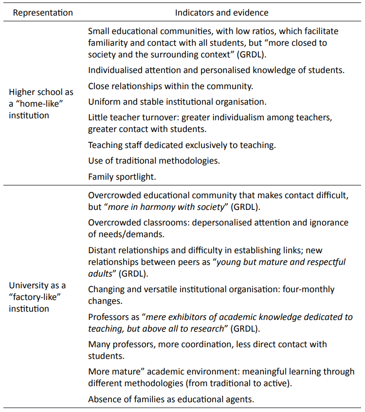 The change from high school to university education implies a break with significant people and institutions. There is a certain disappointment on seeing it as an infantilised environment in which two differentiating characteristics can be identified: overcrowded classrooms and the coldness of professor-student relationships.