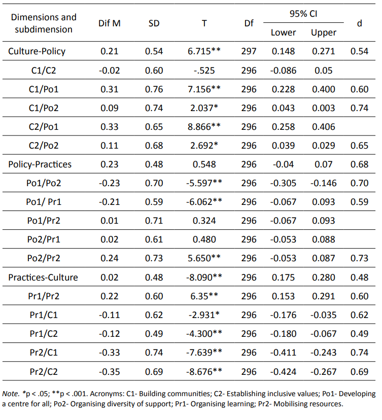 Table 5 shows that the appraisal of the inclusive culture is significantly higher than the inclusive policy (p < .001), especially in the establishment of inclusive values, as well as in the practice of inclusion (p < .001). The university’s capacity to build inclusive communities was rated higher than the organisation of learning in the classroom (p = .004) and resource mobilisation (p < .001), as was the establishment of inclusive values than the organisation of learning (p < .001) and resource mobilisation (p < .001). Consistent with these results, it is worth referring to the contribution of a participant who evidences the role attributed to the teacher and the university institution in the path towards educational and social inclusion:
