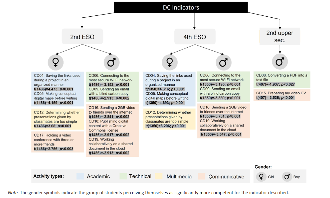 However, when the specific indicators for DC were analyzed in more detail, it became clear that girls do not always see themselves as having a lower level of DC compared to boys. In the study reported here, girls perceived themselves as having significantly greater skill in performing activities that were primarily academic (making digital concept maps before writing) and related to multimedia (determining whether presentations given by their classmates were too simple). In contrast, boys reported greater skill in technical activities (connecting to the most secure WiFi network) and communications (sending a 2GB video to friends over the Internet, and working collaboratively on a shared document in the cloud). These differences reflect those previously reported by various authors (Amor & Serrano, 2019; Bunz et al., 2007; Martínez-Piñeiro et al., 2019). However, all of these differences disappear by upper secondary school, at which point, in this study, girls no longer reported higher levels of competence than boys in any of the indicators. It is therefore prior to the upper secondary school phase when action must be taken to help girls improve their DC self-perception.