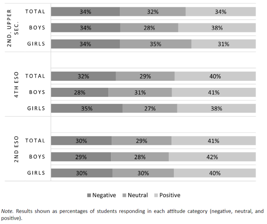 The same types of analysis were performed in order to study potential gender- based differences in attitude towards DTs. Figure 3 shows the proportion of students, broken down by gender and secondary school year, who have a more positive, neutral, or negative attitude towards DTs. In general, most students reported a positive attitude, although in similar proportions to the numbers of students who said they had a more neutral attitude, especially in the 2nd year of upper secondary school. Table 3 shows the data on the mean scores for attitude, broken down by gender.