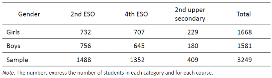 To address the research questions, non-probability convenience sampling was used to collect survey responses from voluntary respondents, who were students from the Spanish regions of Catalonia, the Valencian Community, Extremadura, the Community of Madrid, Andalusia, Aragon, Cantabria, and Murcia. As shown in Table 1, a total of 3363 responses were obtained from students between 13 and 18 years of age in the 2nd year of ESO, 4th year of ESO, and 2nd year of upper secondary school.1 It is important to point out that 46 of those students identified as gender nonbinary and 68 preferred not to respond to the question on gender (DK/NR), so the total sample used in the study consisted of 3249 boys and girls.