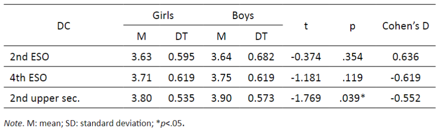 A more detailed comparative analysis of the mean scores by gender (Table 2), using a ttest, shows that for both boys and girls, self-perceived DC improves as the students advance through secondary school, although the mean score for girls is always a few tenths of a point lower. These differences were found to be statistically significant (p = .039) in the 2nd year upper secondary students, which is also confirmed by the effect size (Cohen’s D), which is close to the value of 0.8.