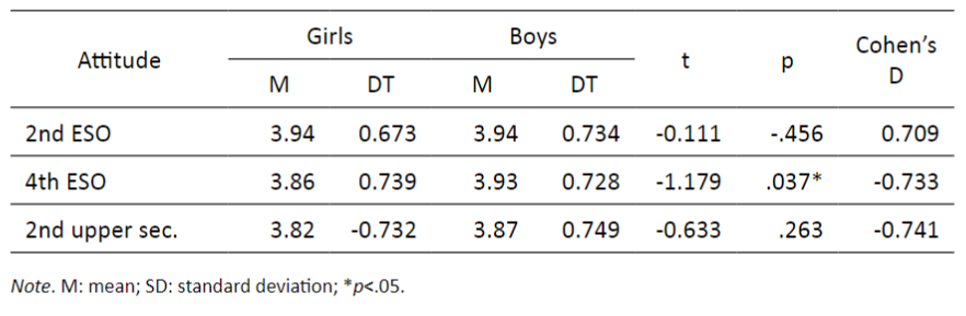 In relation to the second variable studied, boys reported having a better attitude towards DTs than girls do. This was true across educational levels, but especially for students in the 4th year of ESO. These results are in line with previous research in which girls have reported a more negative attitude towards DTs (Cussó-Calabuig et al., 2018).