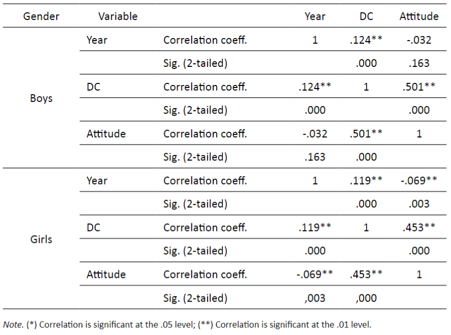 The results described above were confirmed by the correlation analysis (Table 4). Self-perceived DC improved significantly over time for both girls and boys, in a very similar manner. On the other hand, attitude towards DTs worsened significantly only for girls. Although the data for boys also showed a downward trend, it was not statistically significant