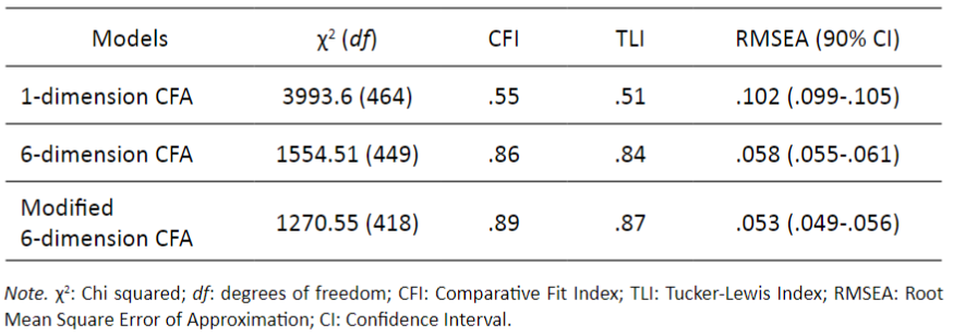 Table 1 shows the goodness of fit indexes of the CFA models tested. The unidimensional CFA was found to have poor fit. The six-factor CFA, tested in order to confirm the structure of the Spanish version of the instrument, had a better fit than the unidimensional model. Nevertheless, the modification indexes indicated that the fit of this model could be improved by allowing item 18 to be part of several dimensions. The decision was therefore made to allow this item to weigh in two of them. Moreover, item 28 was eliminated for weighing in several different dimensions. The fit of this last modified model was close to acceptable. The standardized factor loadings resulting from this model are presented in Table 2. All loadings were statistically significant and over .40, except for those corresponding to items 13 and 20, which were above the .30 threshold.