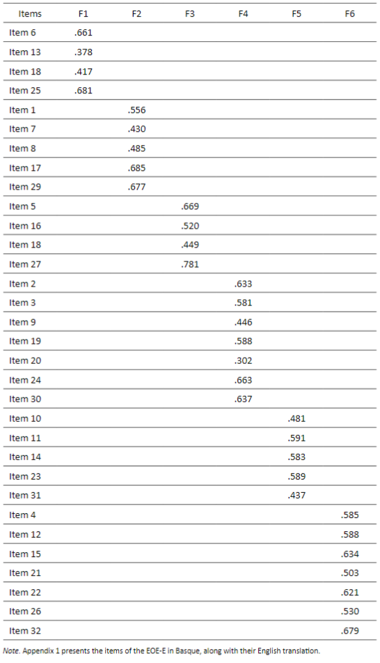 With the aim of analyzing the dimensions of the EOE-E, different Confirmatory Factor Analysis (CFA) models were tested. The Weighted Least Squares Mean and Variance adjusted (WLSMV) method was used as estimation method. The Comparative Fit Index (CFI), the Tucker-Lewis Index (TLI) and the Root Mean Square Error of Approximation (RMSEA) were used as goodness of fit indexes. In the case of the CFI and the TLI, values of over .90 are deemed to indicate good fit. In relation to the RMSEA, values of under .08 indicate acceptable fit, and values of under .06 indicate good fit (Hu & Bentler, 1999).