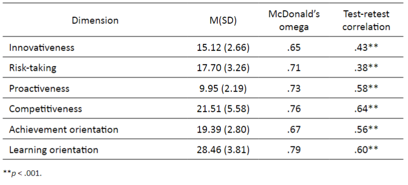 The Pearson correlation coefficients between the scores obtained in the six dimensions of the EOE-E and the Entrepreneurial Attitude Scale were .27, .25, .47, .24, .32 and .33 (p = .001), respectively, for the innovativeness, risk-taking, proactiveness, competitiveness, achievement orientation and learning orientation dimensions.
