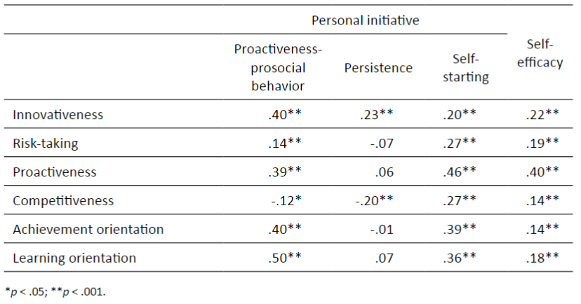 Table 4 shows the Pearson correlation coefficients between the six dimensions of the EOE-E and the three dimensions of the EMIPAE-E (proactiveness-prosocial behavior, persistence and self-starting) and the General Self-Efficiency Scale. Said table reflects the positive, moderate correlations observed between innovativeness and the proactiveness-prosocial behavior dimension of personal initiative. Proactiveness, achievement orientation and learning orientation showed positive moderate correlations with proactiveness-prosocial behavior and self-starting dimensions of personal initiative. Proactiveness also correlated positively and moderately with self-efficacy. Other statistically significant correlations were observed, but none of them reached a moderate effect size (r ≥ .30).