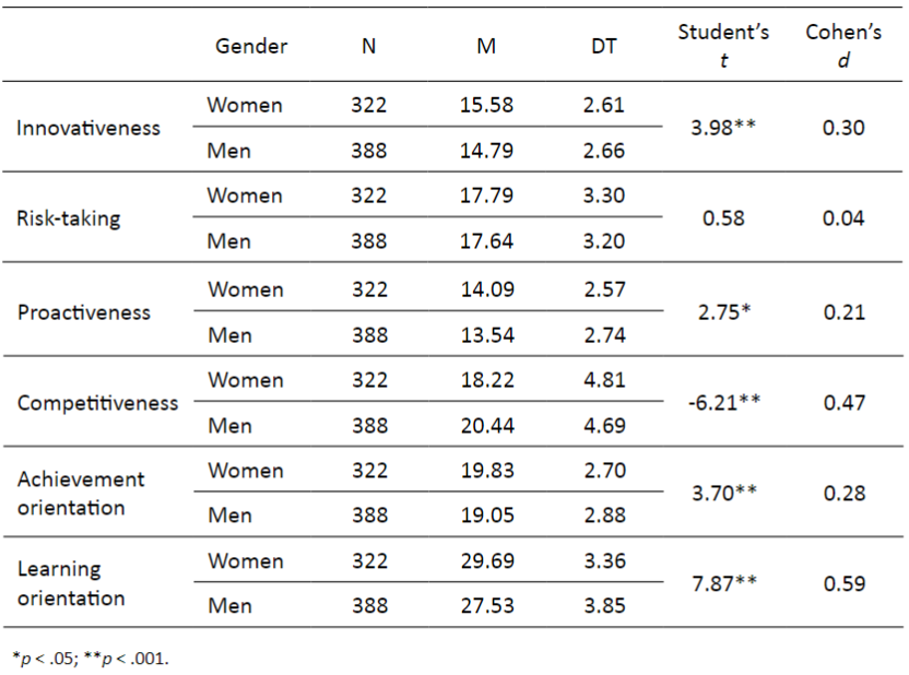 As shown in Table 5, men obtained higher mean scores than women in competitiveness, whereas women scored higher in learning orientation. In the case of innovativeness, proactiveness and achievement orientation, although the gender differences observed were statistically significant, their effect size was small.