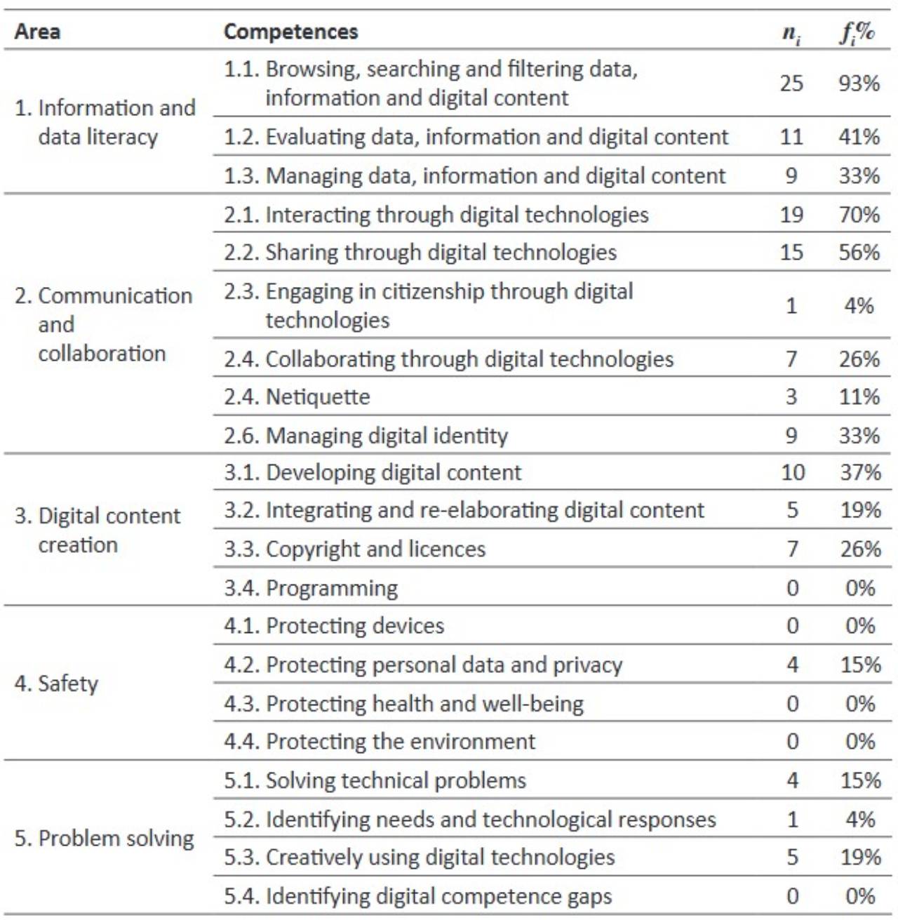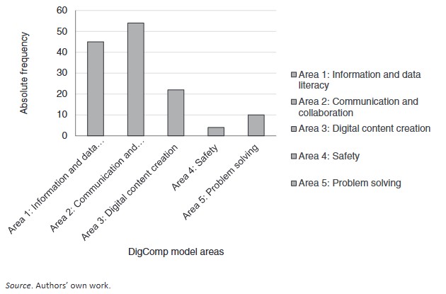Analysis of the DigComp competences reveals that they focus particularly on area (2), Communication and collaboration (n = 54), and (1) Information and Data literacy (n = 45), and much less on (4) Safety (n = 4) (Figure 1). Analysis by competences (Table 2) shows that the most repeated is Browsing, searching and filtering data, information and digital content (n = 25, 93%), followed by Interacting through digital technologies (n = 15, 66%). However, the least identified are Engaging in citizenship through digital technologies (n = 1, 4%) and Identifying needs and technological responses (n = 1, 4%), while others are not identified at all (Programming, Protecting devices, Protecting health and well-being, Protecting the environment, and Identifying digital competence gaps).