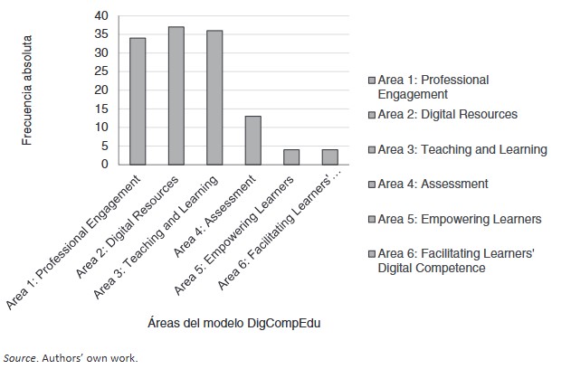 As regards area (2), Digital Resources, the competence Selecting digital resources is the most present, which could point to teachers requiring access to external content because they may not have the ability to create their own (Basilotta-Gómez-Pablos et al., 2022). In line with previous research, improving teachers’ digital competence calls for further training in digital content creation (Jiménez-Hernández et al., 2020).