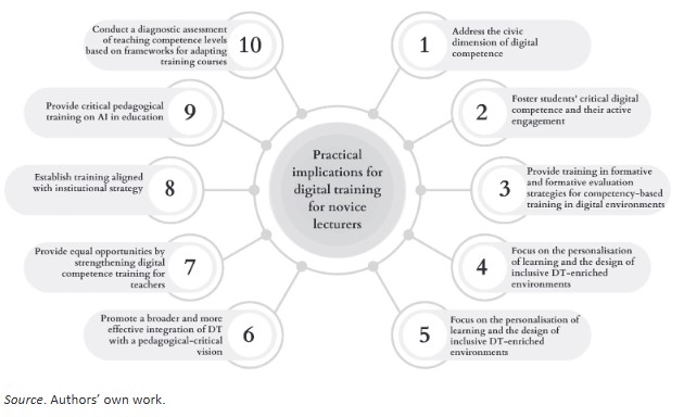 The results presented can provide useful information for creating training plans for novice university teaching staff that include different areas of digital competence and digital competence in teaching, thus ultimately contributing to enhancing the quality of higher education in Spain. Likewise, it is important to continue researching and sharing good practices in this area to improve university teacher education and ensure sound professional development of teachers at the induction stage.