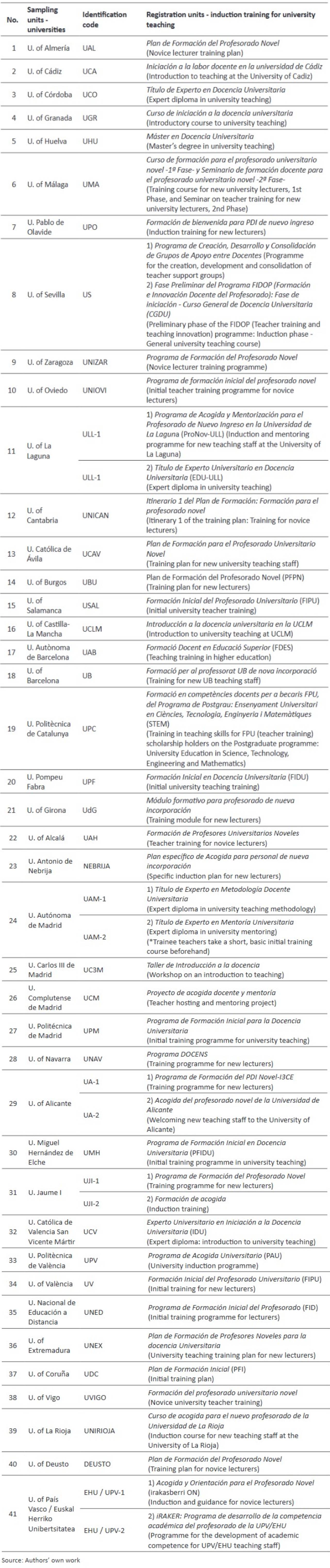 Once the database had been compiled, a documentary analysis of the induction programmes of these 41 universities was carried out. The unit of record was comprised of the documents or web pages explaining each training proposal offered by the universities selected. In this phase, two different training programmes were found in five universities. The total number of units of analysis was 46 training programmes aimed at new teaching recruits (Table 1).