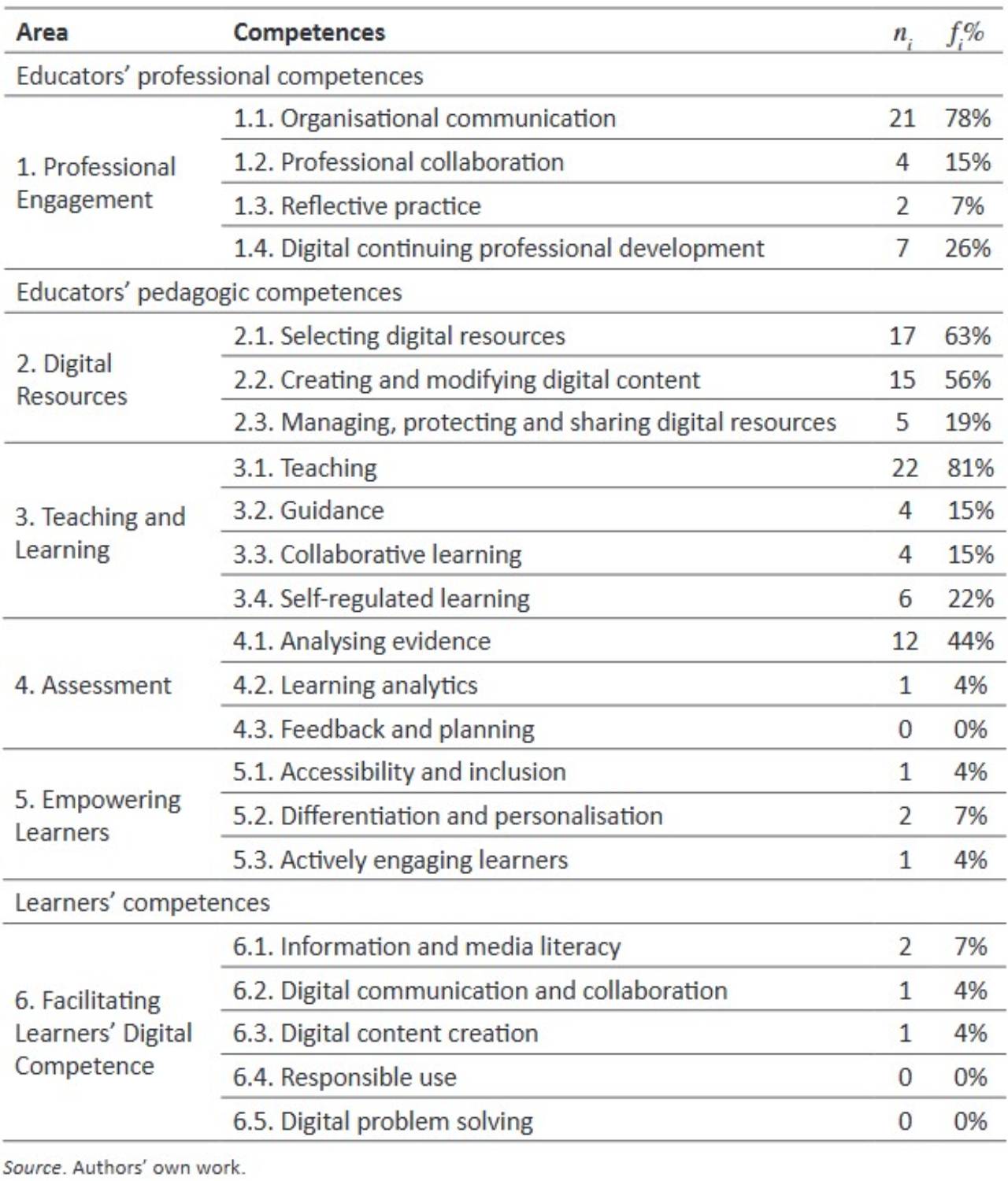 Figure 2 and Table 3 show the results of the analysis based on the DigCompEdu, highlighting the most identified areas: (2) Digital Resources (n = 37), (3) Teaching and Learning (n = 36) and (1) Professional Engagement (n = 34). The most frequently identified competences are Teaching (n = 22, 81%), Organisational communication (n = 21, 71%) and Selecting digital resources (n = 17, 63%). The areas that are recognised to a lesser extent are (5) Empowering Learners (n = 4) and (6) Facilitating Learners’ Digital Competence (n = 4).