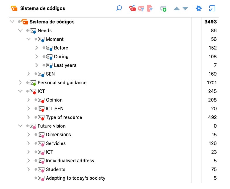 MAXQDA 2022 software was used to analyse the interviews by creating categories and codes through content analysis. Categories were created based on the interview blocks, using a horizontal coding strategy—analysing the same question comprehensively across all interviews. This was done to maximise result homogeneity for each item. A total of 4 general categories and 685 codes were created, encoding a total of 3,493 segments (Figure 1).
