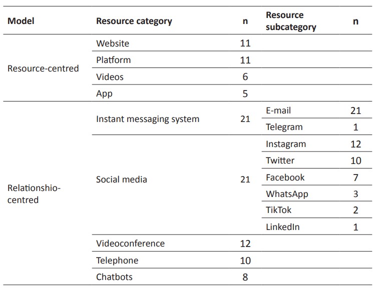 Looking at the technological resources used by Guidance Services (Table 5), framed by the resource-centred model, what stand out are the use of websites (n=11), platforms (n=11), video (n=6), and apps (n=5). From the relationship-centred model, email (n=21) is included, with the observation that students do not commonly use it (n=13): “Its use still exists, but what happens with this medium is that students don’t read it” (ID08). This might, among other factors, be because students do not have the habit of using email, or because they are suffering information overload.