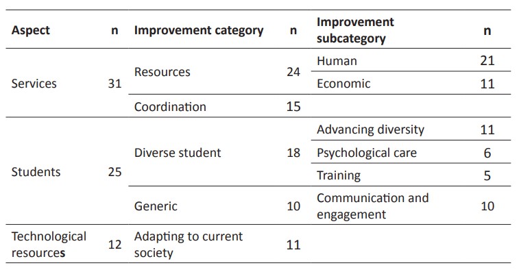 Secondly, interviewees also noted aspects for improvement related to the different student profiles. On one hand, for students with diverse needs (n=18), there is a need to improve diversity (n=11) and psychological support (n=6). This requires better individualised attention and a more visible profile of the diverse student population at university to “identify and implement necessary plans” (ID30). There is also a need for more teacher and student training (n=5) so they can address various student profiles and normalize diversity: “Teacher training should focus on more specific attention in the classrooms” (ID24). In addition, more generally, interviewees noted (n=10) that there needs to be better communication with students and engagement from Guidance Services (n=10) to create a bond of trust between the two parties and encourage students to seek services when needed.