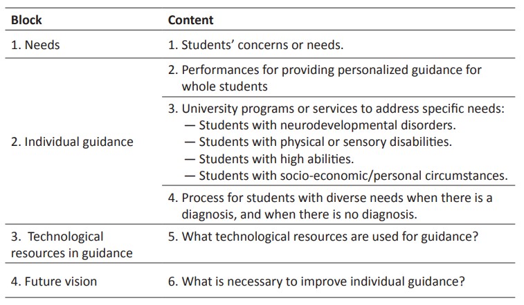 Block One, linked to student needs, was designed to introduce the topic of interest to the interviewees. Block two focused on personalized guidance. It was created following consultation of previous research that mentions a heterogeneous intake profile in universities, such as students with educational support needs or socio-educational disadvantages (Davis et al., 2021; Stanwood & Mittiga, 2022). In the present study, diversity was understood as any student profile requiring specific attention tailored to the individual’s temporary or permanent needs, adhering to the principles of inclusion in current legislation (LOSU, 2023). Within this diversity, there are also profiles of students starting university with a pre-existing diagnosis, such as dyslexia or Attention Deficit Hyperactivity Disorder (ADHD).